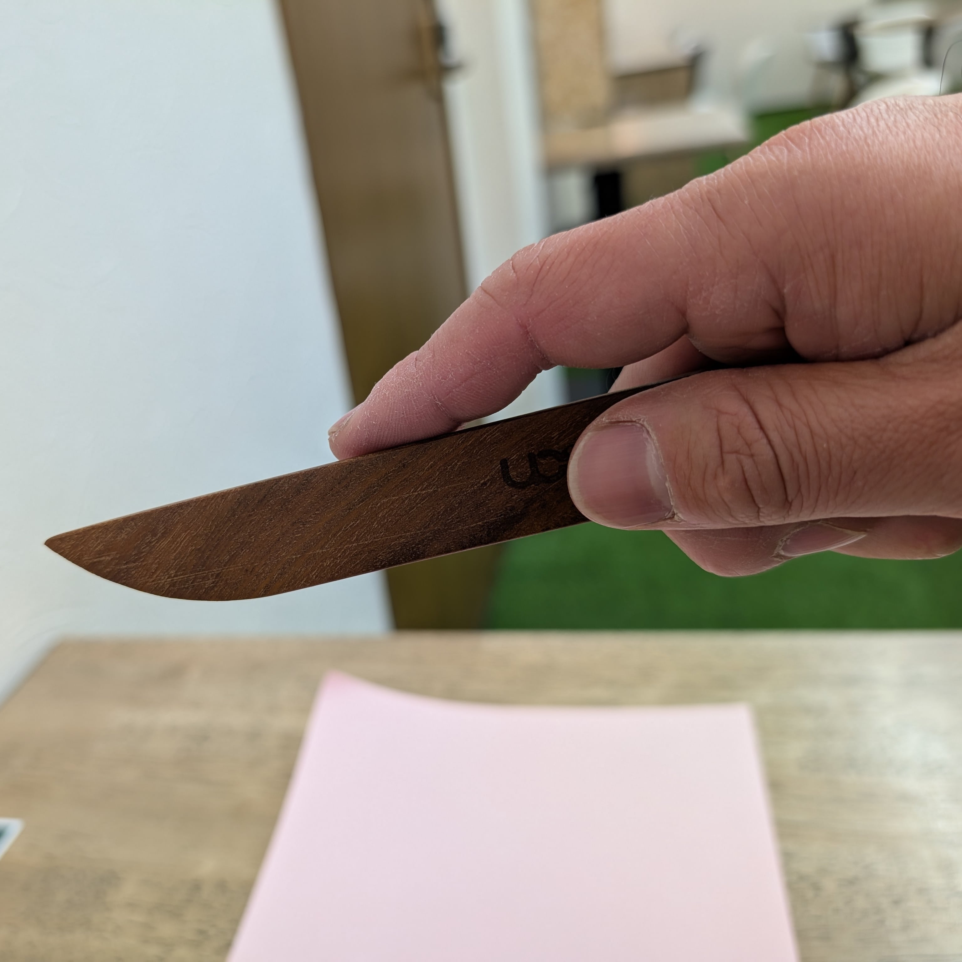 こちらの折りへらは現地職人により一枚ずつ丁寧に手作りされており、木はウリンが使用されています。ウリンはインドネシアのカリマンタン島(ボルネオ島)若しくはその周辺の島でしか生息していない貴重な木材で、別名アイアンウッド(英語名:ironwood)と呼ばれる程頑丈な木です。耐久性だけでなく豊富なポリフェノールが含まれているので抗菌性にも優れています。日本では1996年に輸入が解禁されました。